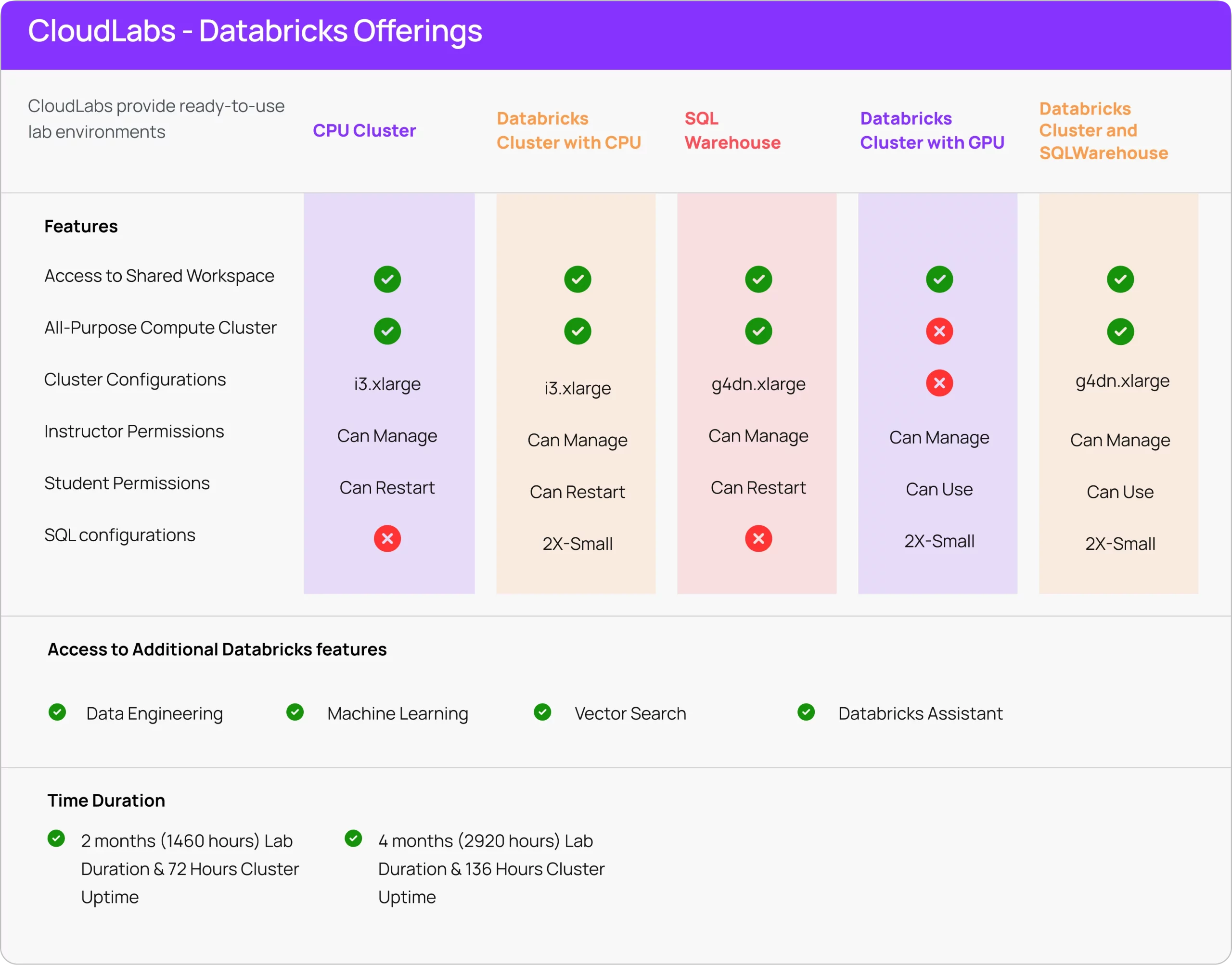 At CloudLabs, our goal is to empower learning and enablement through modern and immersive technological experiences. By collaborating with Databricks University Alliance, we aim to provide access to a stimulative and demonstrative learning environment comprising hands-on labs that are secure, budget-friendly, and tailor-made for teaching and learning - Data, AI, and Cloud skills. Our managed Databricks lab environments are practical, flexible, and easy to access, assuring convenience for everyone with interest.